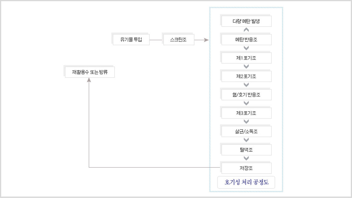 | 원리 | 메탄화 소화원리와 호기성 처리방식을 복합적으로 이용한 완전분해 시스템 처리 과정에서 발생된 다량의 메탄가스는 자원화하여 연료절감 |