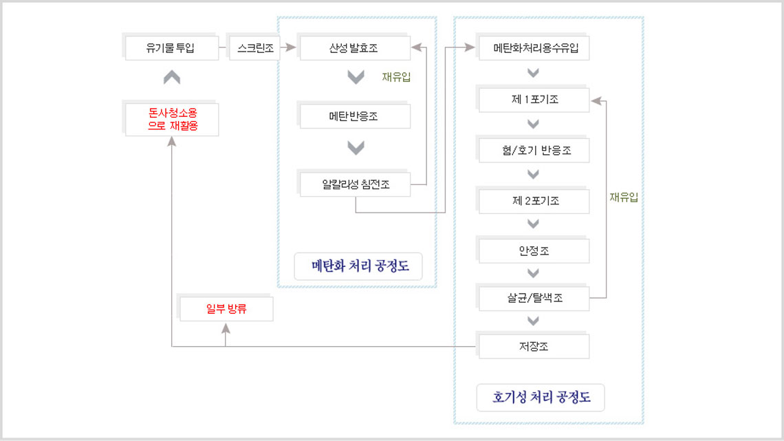 - 일반 분뇨 처리과정을 혐기성(산성 발효조, 메탄 반응조, 알칼리 침전조)과 호기성(정화정수조의 폭기 처리)등으로 구분하여 단계적으로 생물학적 처리